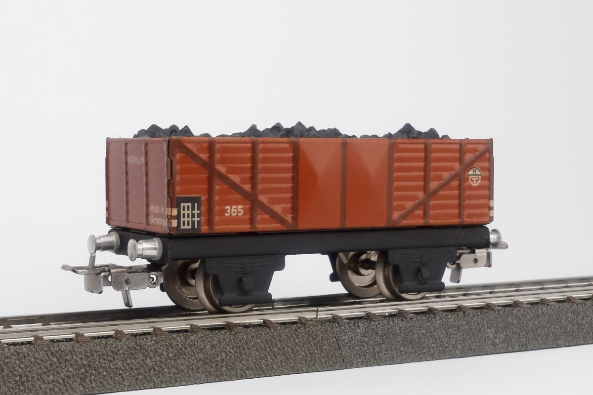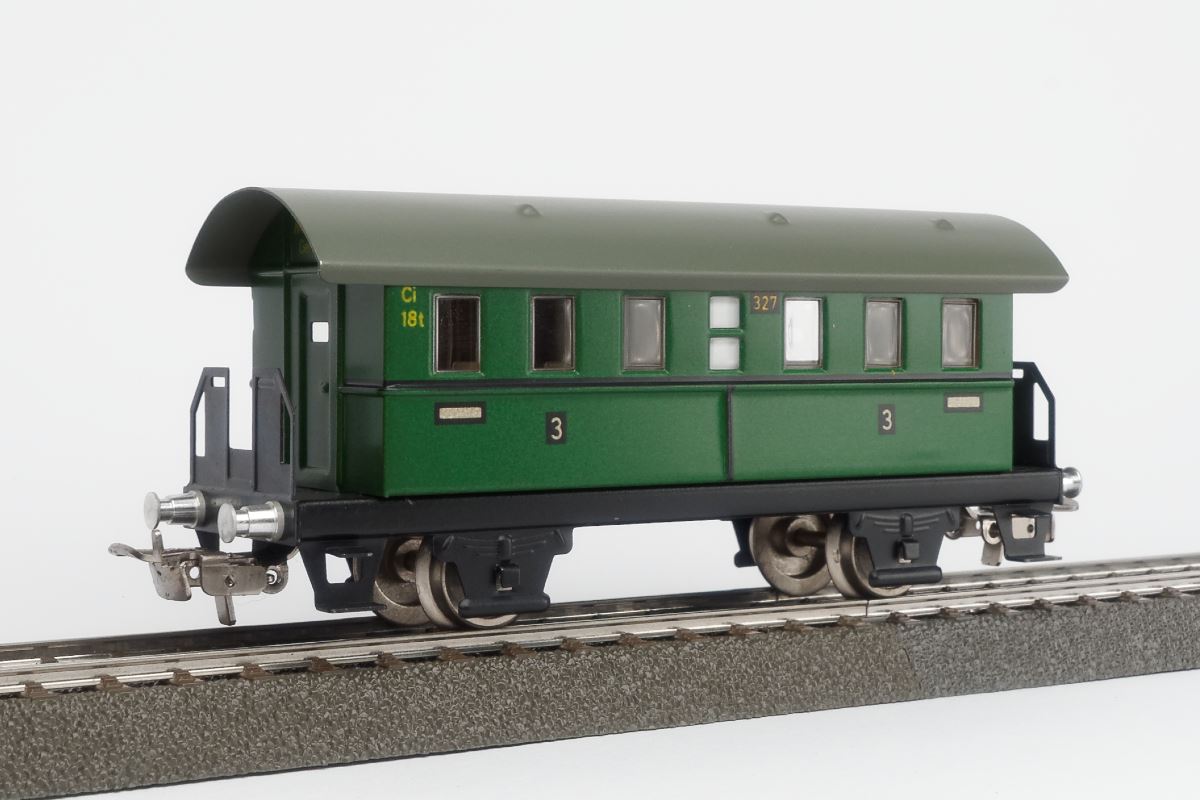 Alle Modelle in Blechausführung. Inhalt: Dampflokomotive mit Schlepptender, 3 Personenwagen mit Auschrift 327, Elektrische Lokomotive mit 3 verschiedenen Güterwagen.