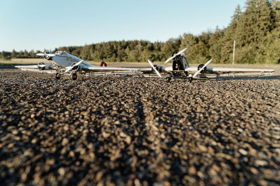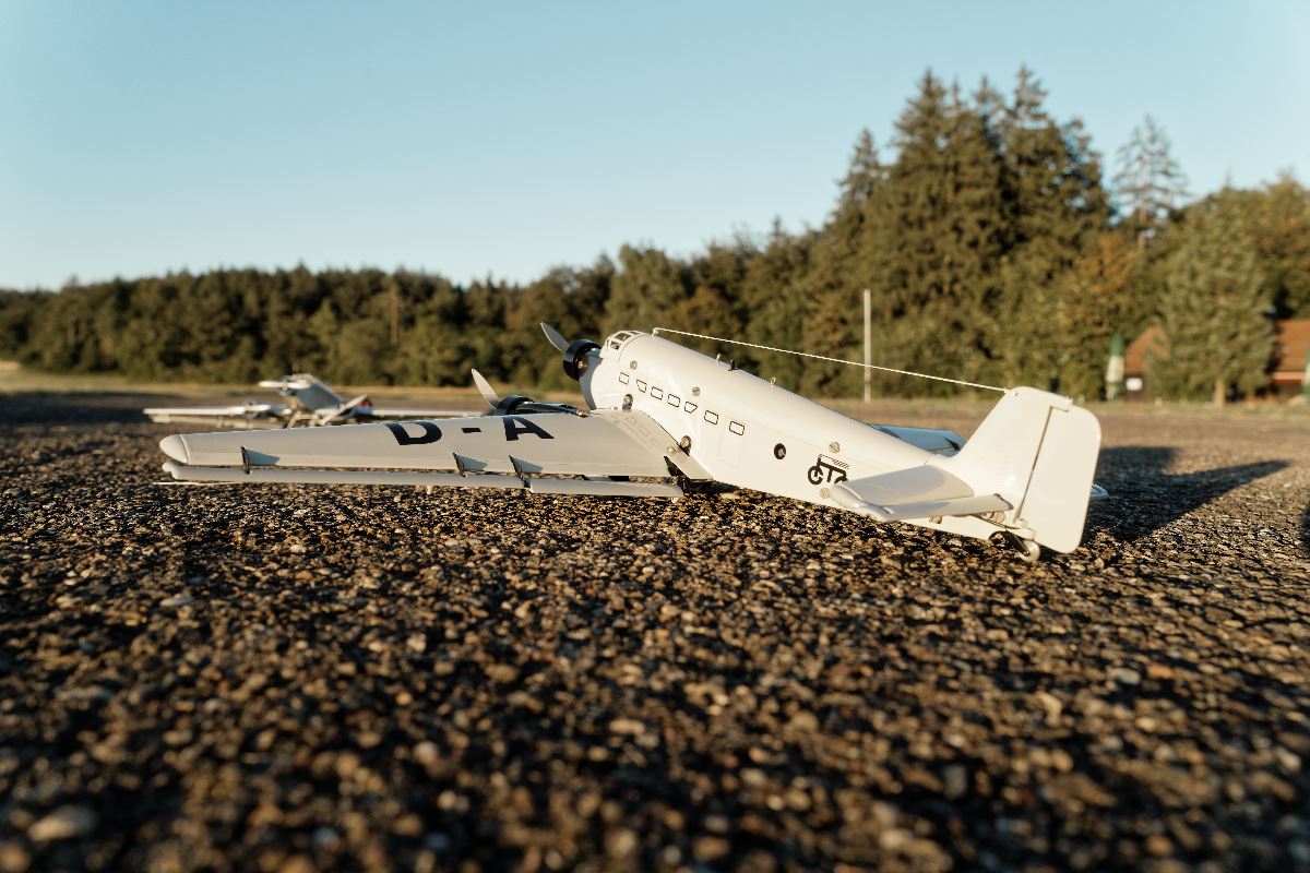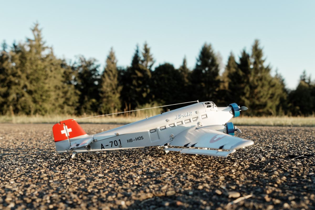 Modell einer Ju 52 der Schweizer Luftfahrtgesellschaft Ju-Air. Modell aus Metall gefertigt. Eingebauter Uhrwerkmotor zum Antrieb der drei Propeller. Bewegliche Höhen-, Seiten- und Querruder. Kanzelabdeckung beweglich. Spannweite: ca. 56 cm.